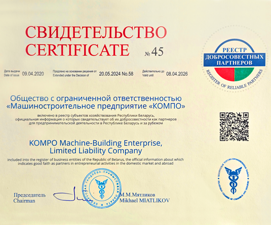 С гордостью сообщаем, что компания КОМПО в очередной раз получила сертификат от Белорусской торгово-промышленной палаты, подтверждающий статус добросовестного партнера!