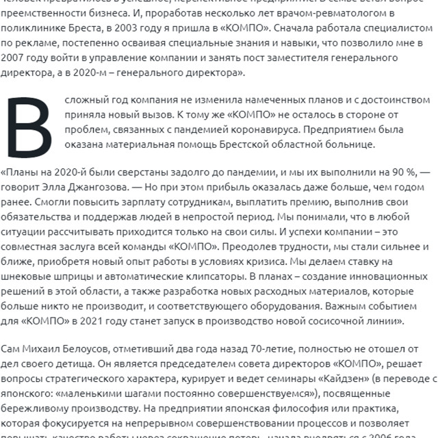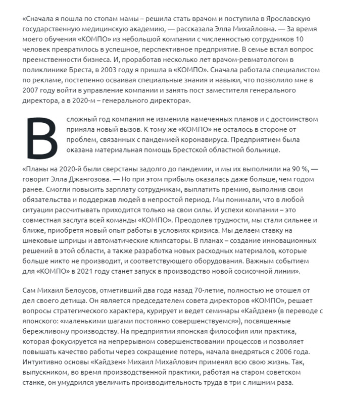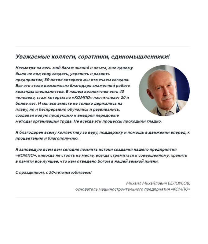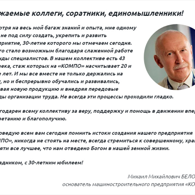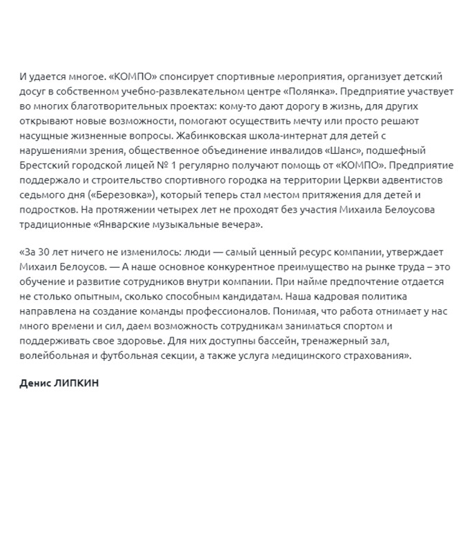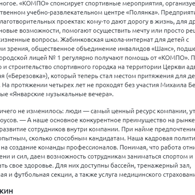 «За 30 лет ничего не изменилось: люди — самый ценный ресурс компании, утверждает Михаил Белоусов. — А наше основное конкурентное преимущество на рынке труда – это обучение и развитие сотрудников внутри компании. При найме предпочтение отдается не столько опытным, сколько способным кандидатам. Наша кадровая политика направлена на создание команды профессионалов. Понимая, что работа отнимает у нас много времени и сил, даем возможность сотрудникам заниматься спортом и поддерживать свое здоровье. Для них доступны бассейн, тренажерный зал, волейбольная и футбольная секции, а также услуга медицинского страхования».