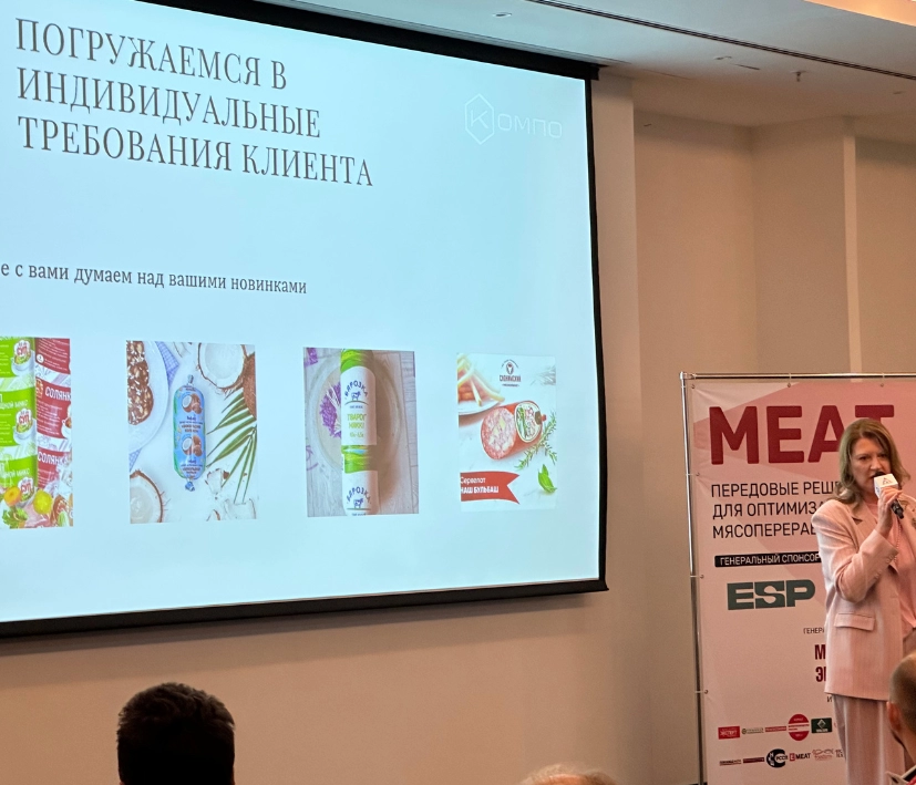 Важным событием стало выступление нашего коммерческого директора, представившей успешные кейсы, реализованные КОМПО в сотрудничестве с ведущими мясокомбинатами. Это позволило наглядно продемонстрировать реальную ценность и эффективность нашего оборудования в практическом применении.
