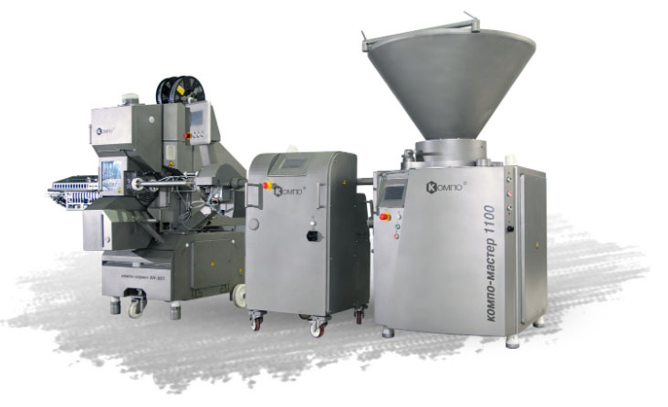 Линейка оборудования состоит из роторного шприца КОМПО МАСТЕР 1100 с подъемником, волчка-приставки ВП-6000 и автоматического клипсатора КОМПО СПРИНТ КН-501.