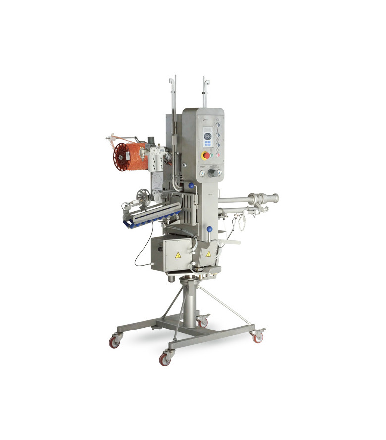 Фасуемая масса подается в бункер шприца, который нагнетает ее через цевку клипсатора в оболочку. Клипсатор осуществляет запечатывание начала и конца батона скрепкой, при необходимости под скрепку автоматически подается шпагатная петля.